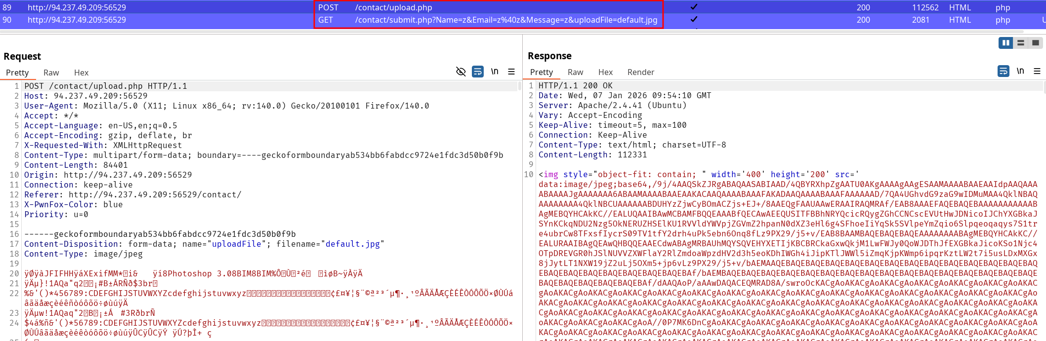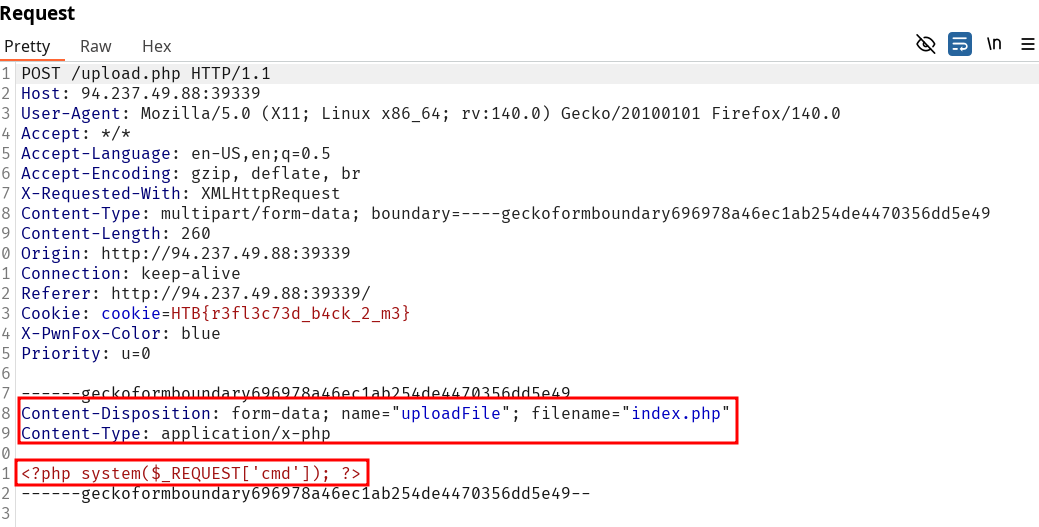 Now is the moment to keep up with the methodology and everything together. We already bypassed the file extension content, and the MIME-Type defines how the server accepts our file upload. GIF8 is not validated upon checking file upload but it’s not the only way to confuse a webserver and upload file that would allow command execution. Remember when we worked with out jpeg request previously ? We can try to get back to this checkpoint.