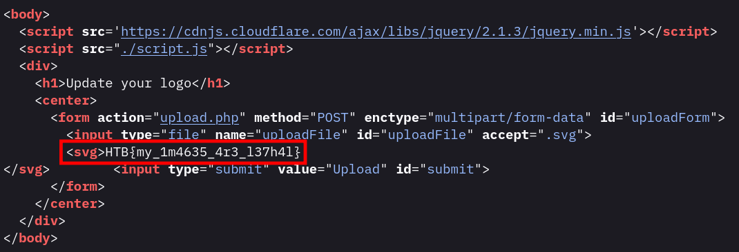 However, since SVG is accepted I tried to retrieve information through file reading. Since the question to solve the assessment doesn’t specify the file is /flag.txt obviously we’ll have to obtain a webshell at some point, or an error that allow for directory enumeration. Malicious SVG file triggering XML external entity (XXE) injection is conclusive and the server sends back the content of /etc/passwd. From this point since the server is using php I try to execute a simple file reading using filters and obtain the source code for upload.php.