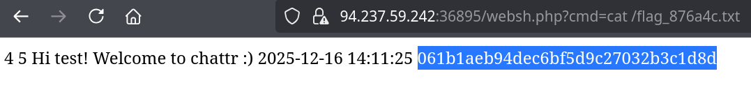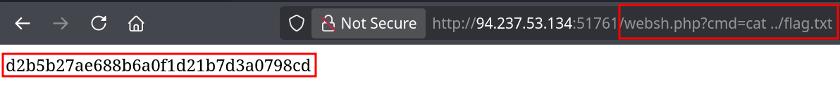 And then we can use that web shell to retrieve the flag (skipped the intermediate command to identify the flag file name):
