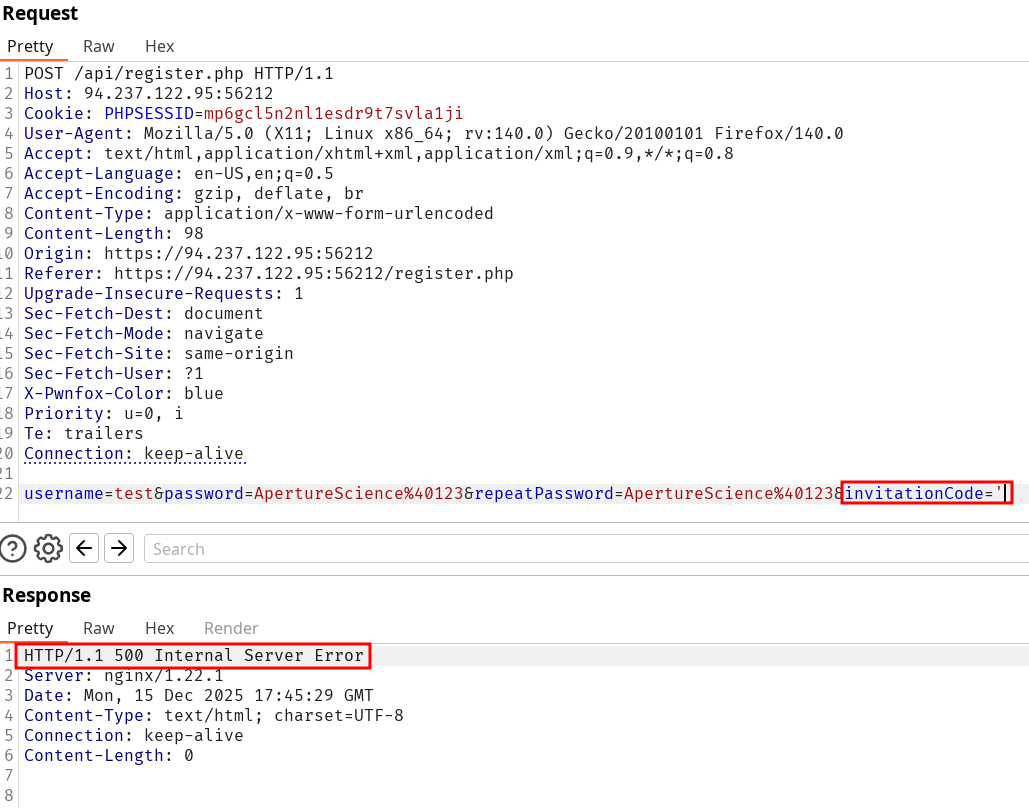 However, the Register might be injectable. We are redirected to a /register.php?e=invalid+invitation+code using a sane formular but as soon as use ' on the invitationCode field we get a 500 Internal Server Error response code. Using two single quotes gets back to the expected state so we’re digging on this.