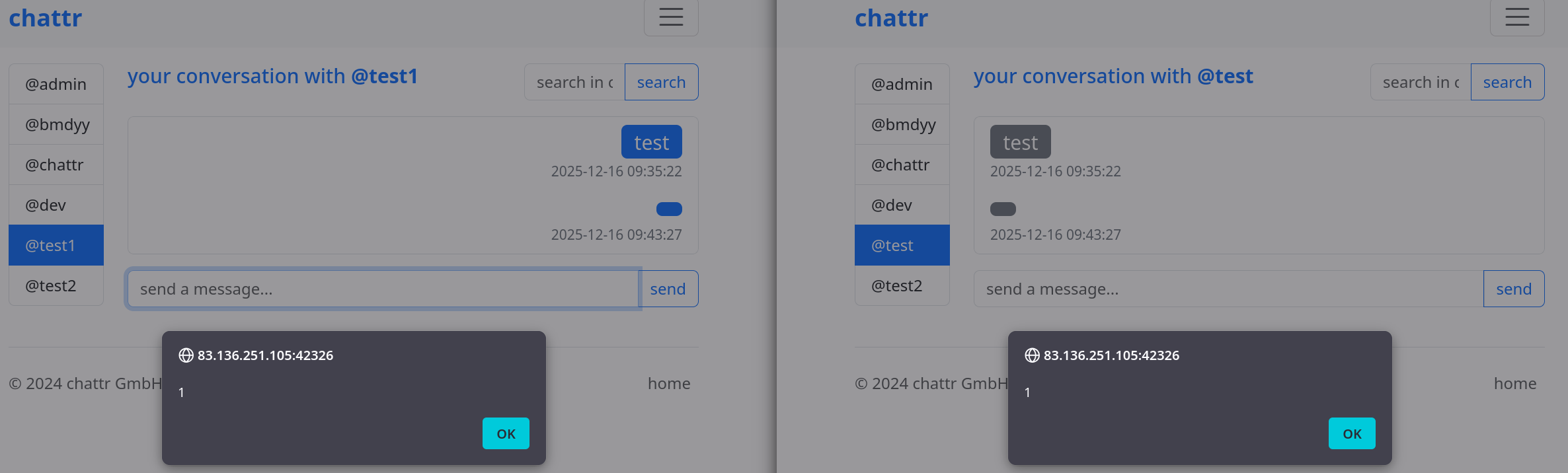 We have confirmed our login into the Web-App using the registration credentials supplied, now we can continue looking for more vulnerabilities. From the login screen we can see (every ?) users registered and start chatting with them. Instead of messaging the administrator directly I’ll just create an other account and examine the interactions between my two profiles.