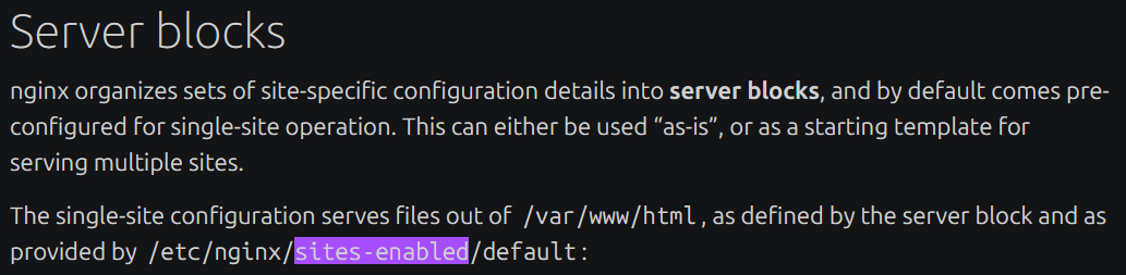 From this point I was stuck for a while to determine the root path of the web-app since the nginx.conf file indicates sites-enabled and the Nginx documentation doesn’t provide a “default” file name. Turns out Ubuntu’s documentation on the other hand gives some examples :