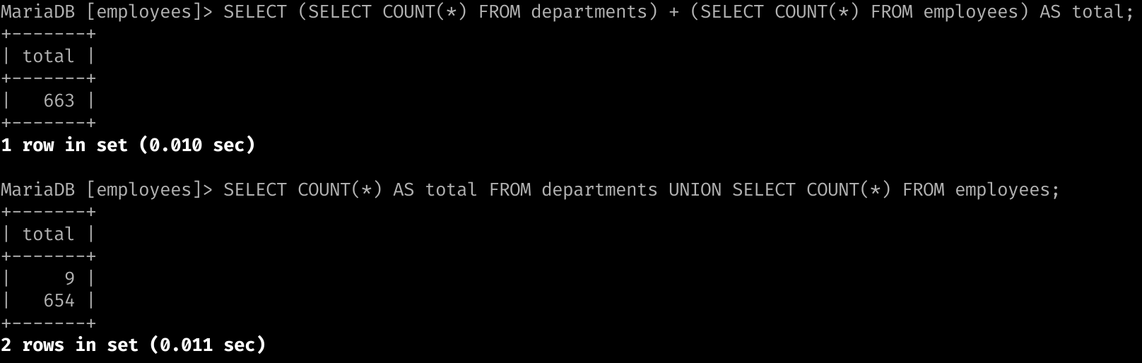 SELECT (SELECT COUNT(*) FROM departments) + (SELECT COUNT(*) FROM employees) AS total;