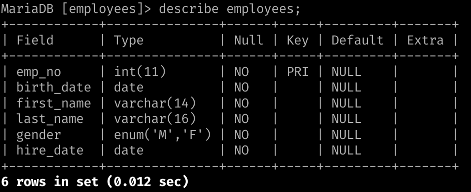 SHOW DATABASES;SHOW TABLES;DESCRIBE {table_name};--Choose a database to work withUSE CHOSEN_DATABASE ;