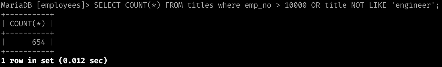 Connect to the above MySQL server with the 'mysql' tool, and find the number of records returned when doing a 'Union' of all records in the 'employees' table and all records in the 'departments' table.