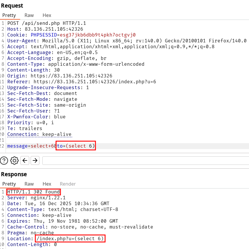 We just mentioned how sending a message could serve to trigger XSS, well inspecting the POST request (or the source code) shows they use the same predictable id as a parameter to identify to which user you’re sending the message. While playing with that field previously in GET requests didn’t return anything interesting, we immediately notice the same type of error as in the registration when quoting the to= parameter in the body :