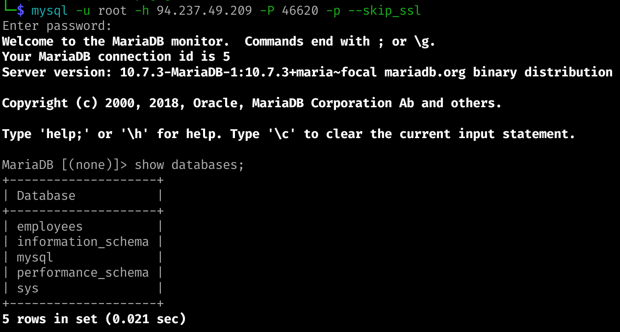 Connect to the database using the MySQL client from the command line. Use the 'show databases;' command to list databases in the DBMS. What is the name of the first database?