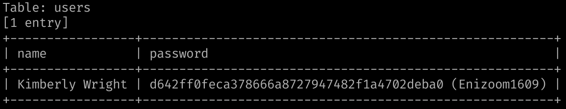 Same principle, if we don’t give any specific cookie here the server response is setting one to id=1 on it’s own, which SQLMap catches. However it won’t lookup for it by default which means you’ll have to specify it. Knowing this, we can use the following command and retrieve the specified content :