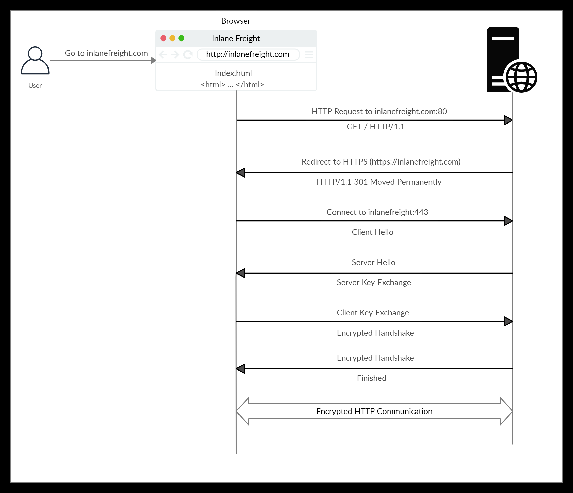 client randomand apremaster secretencrypted using the Server’s public key. Server decrypt using his private key and both generate session keys using the data they possess. - They both Handshake by respectively sending an encrypted “Client Finished” and “Server Finished” with the built encryption key.