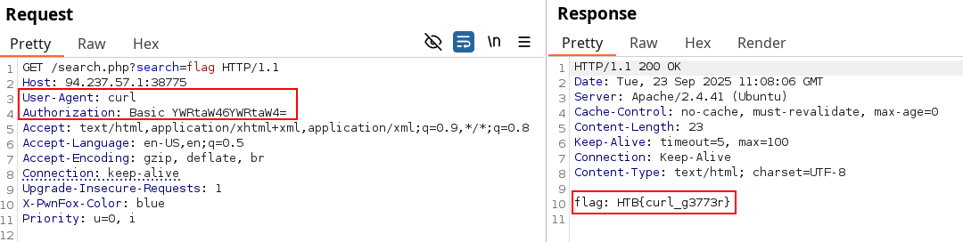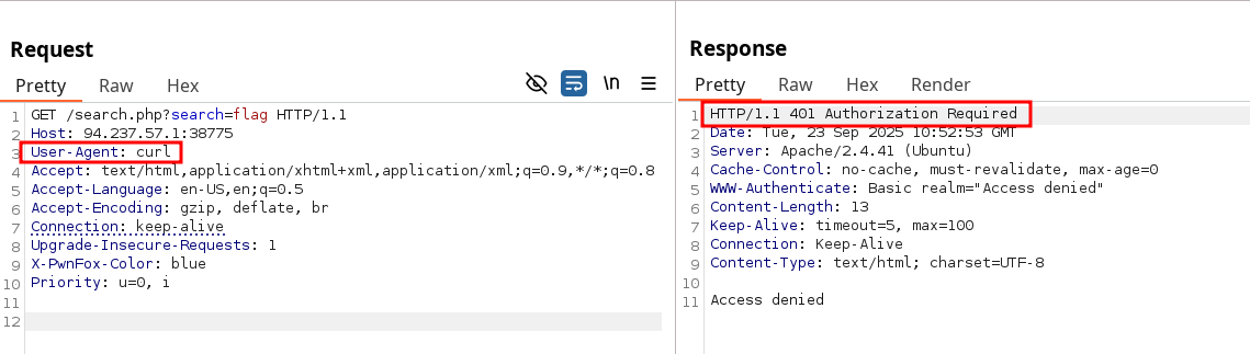 Fun thing to notice here is the server is returning a 200 code even without any Authorization header, but returns a 401 once the User-Agent matches ! It might not be exploitable in this context, but this is a logic flaw vulnerability.