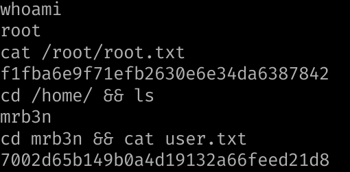 sudo php -r "system('/bin/bash');"Now that we’re root, we can grab both flags at the same time. Note the user flag was already available before the privesc even as www-data user.
