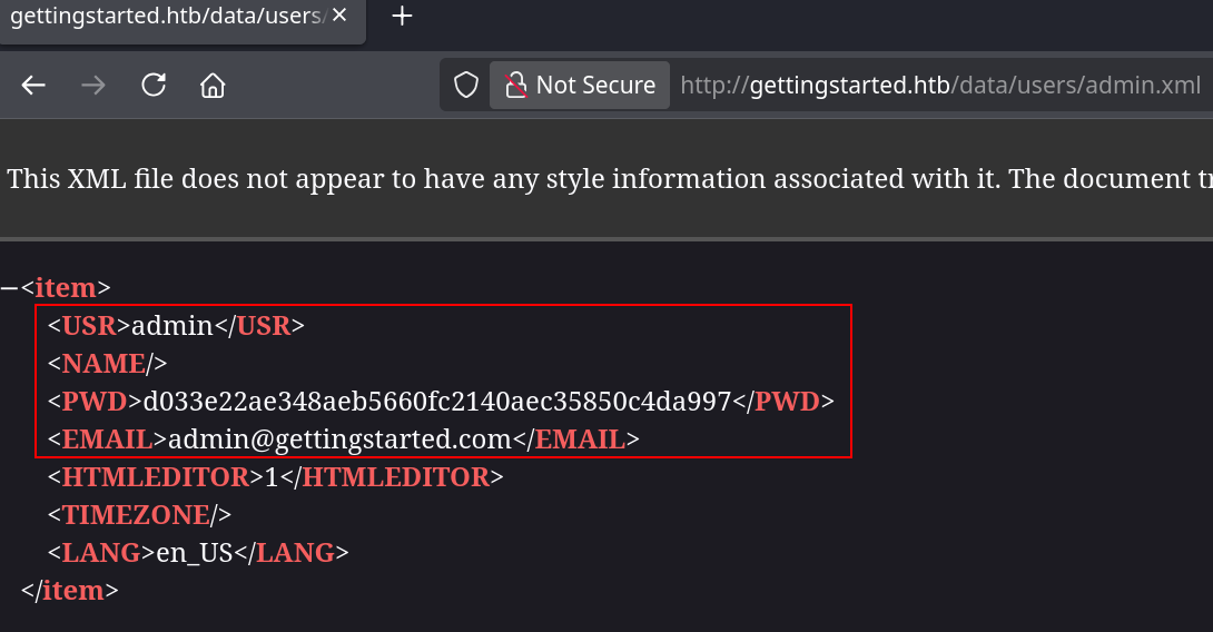 Among the results, the data/users/ path has an exposed admin.xml file with a hash, so cracking it might give us valid credentials. We have a Sensitive Data Exposure vulnerability if the hash is of any use. Most of the website code is also exposed which should be noted.