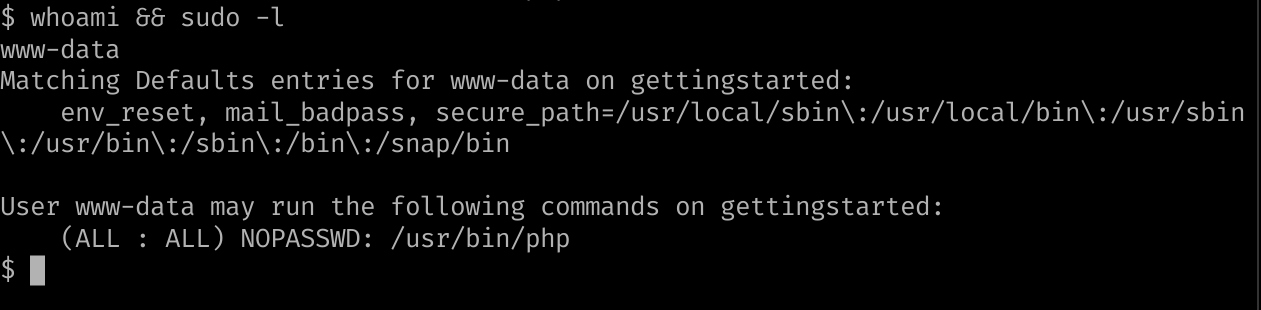 sudo -l. Here we can runphpwith root privilege, and the Privesc is well documented here.