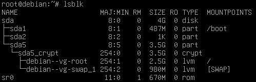 Q3 : We can use lsblk and notice the boot partition is left unencrypted. sda5 is the LVM volume group made during the Debian installation containing the root partition and the swap.