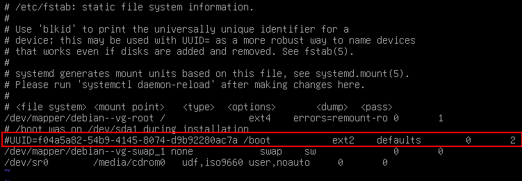 Task3 : Boot partition is now left unused. Modify /etc/fstab by commenting the old boot mount target. Add the CRYPTODISK module to GRUB parameters.