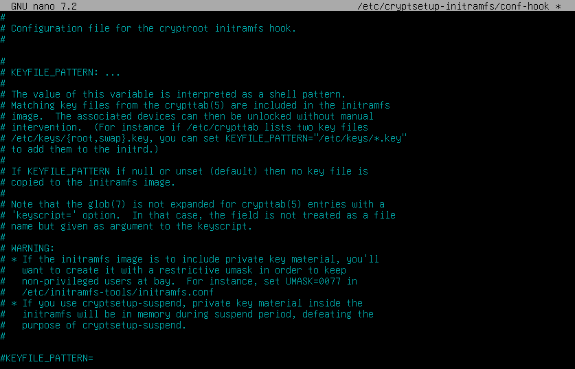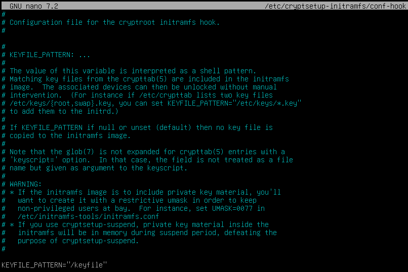 Task 4 : Regenerate the initramfs image. Verify the configuration is correct (lsinitramfs can be used). If the keyfile is correctly added, it should appear under the line cryptroot/keyfiles/sda5_crypt.key.