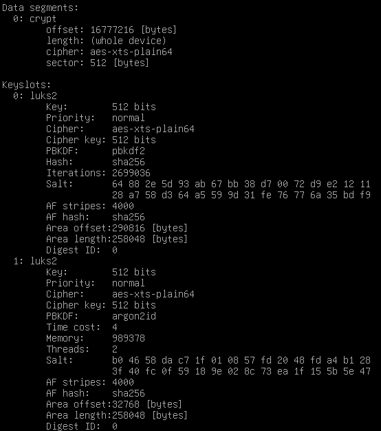 From this point we can edit the LUKS container to switch from Argon2 to PBKDF2 on our active keyslot.