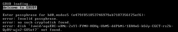 LUKS2 defaults to using Argon2 . Grub pre-boot doesn’t support this KDF (Key derivation function) and needs to be changed to PKBDF2.