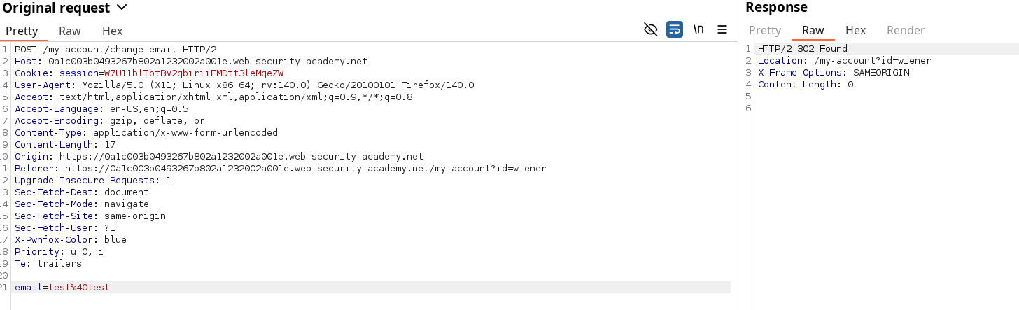 SameSitecookies are not being used). - The vulnerable website will process the request in the normal way, treat it as having been made by the victim user, and change their email address.