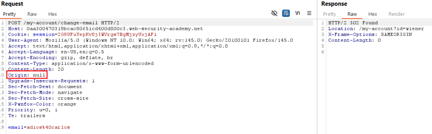Note that in our case the first method work on self but didn’t solve the lab. I’m dubitative on this behavior since origin: null should not be allowed by the server. No response header from the server indicates any Access-Control-Allow-Origin vulnerable parameter, and it certainly doesn’t check for the origin to match it’s own domain since it allows null.