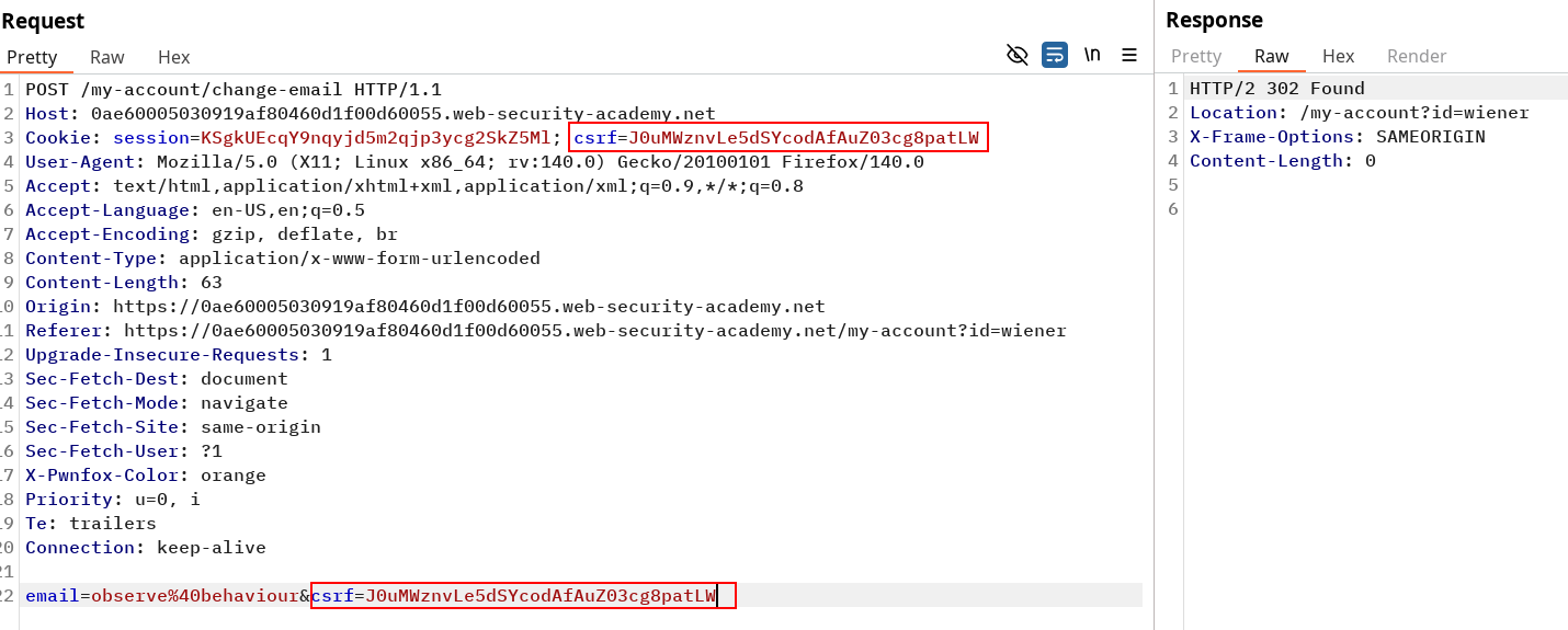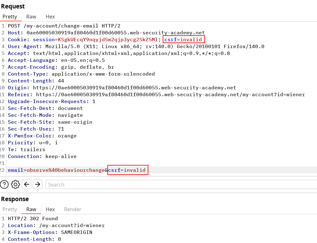 We can try to replay the request with different value still matching and see if we still can change our mail. If the server only checks if both cookie and parameter match, this is insufficient. They should be tied to the user session and consumed.