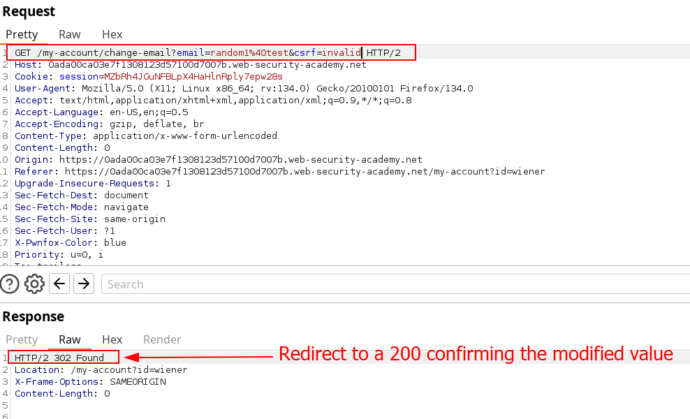 My curiosity tried to delete the csrf token to verify the checking mechanism, showed no result. Changing it with an other value does not validate the request either. At that point, we can try changing the method using GET and passing the parameters in the URL directly. We get redirected and find out the request is accepted directly.