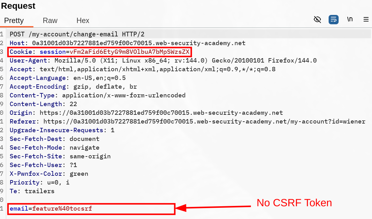 On this lab the whole idea is to make the target get fresh cookies from our payload and trigger the CSRF against it. So first things first, analyze the change-mail request and response :