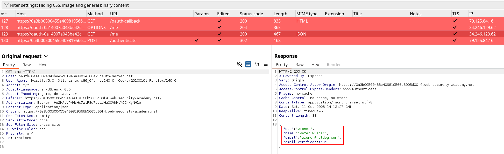 Deployed the lab, used the credentials while logging requests flow and added the OAuth URL to the scope. After using the Oauth authentication with the wiener:peter credentials, I’ve crawled over the requests sent until I found these ones