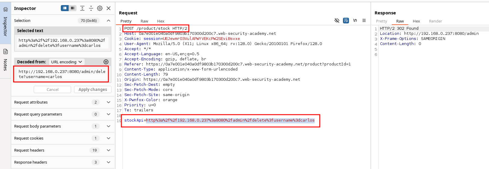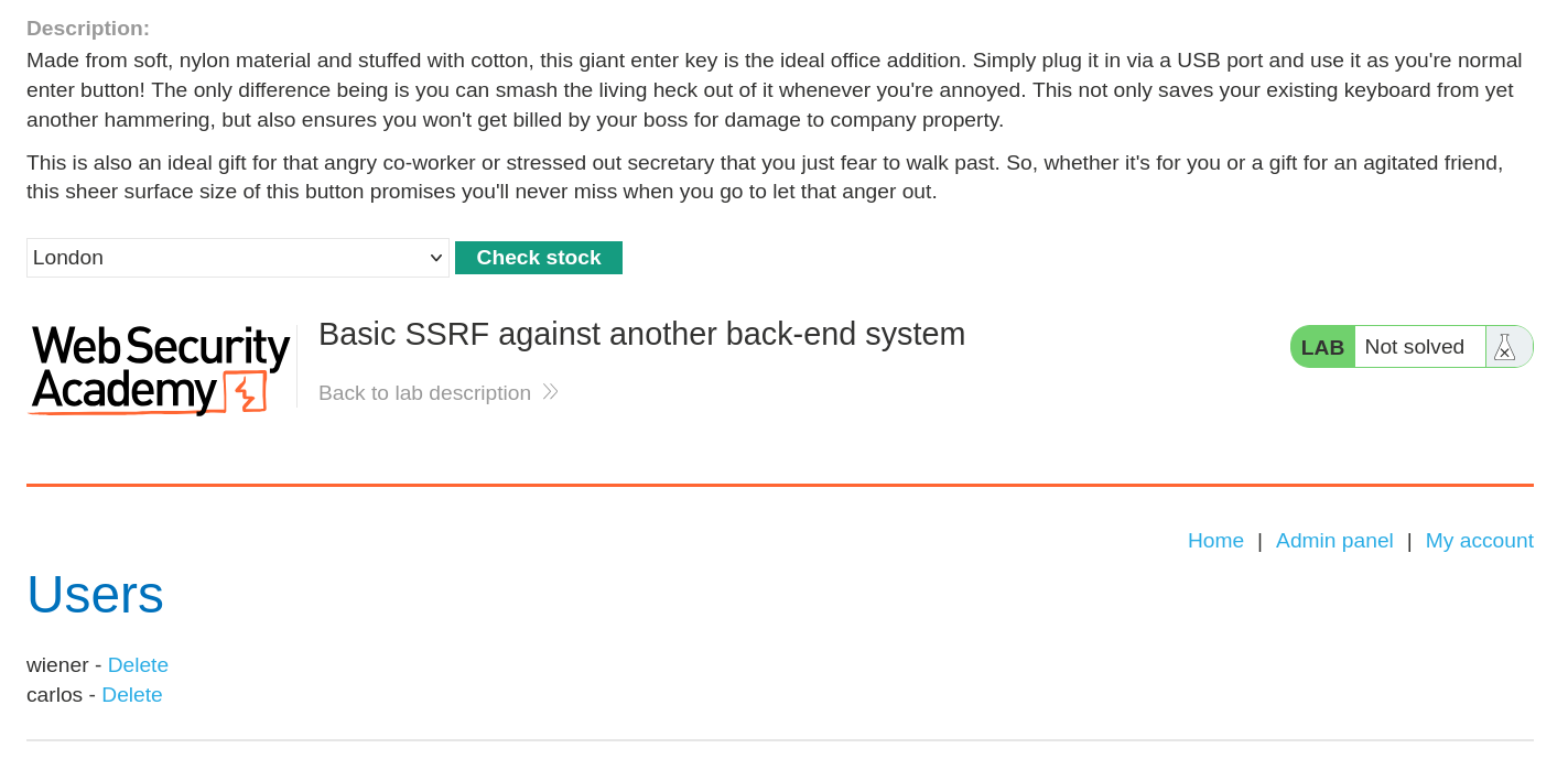 To solve the lab, use the stock check functionality to scan the internal 192.168.0.X range for an admin interface on port 8080, then use it to delete the user carlos
