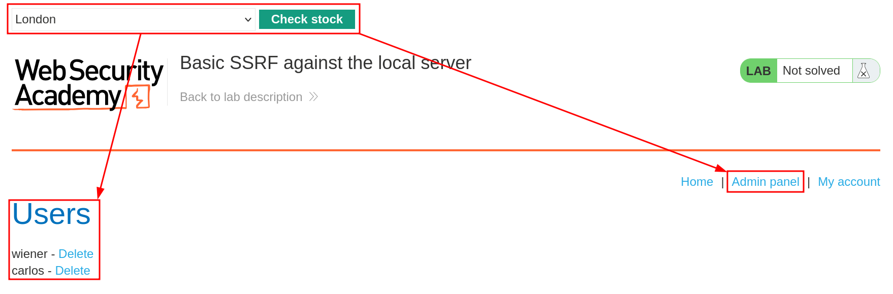 To solve the lab, change the stock check URL to access the admin interface at http://localhost/admin and delete the user carlos.