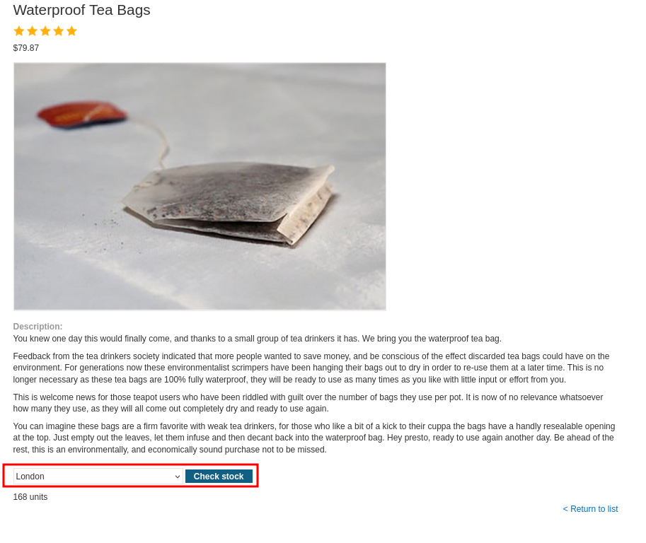 POST /product/stock HTTP/1.0 Content-Type: application/x-www-form-urlencoded Content-Length: 118 stockApi=http://stock.weliketoshop.net:8080/product/stock/check%3FproductId%3D6%26storeId%3D1This causes the server to make a request to the specified URL, retrieve the stock status, and return this to the user.